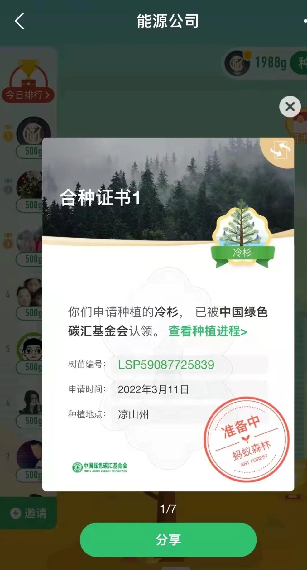 “一花一草皆生命,一枝一葉總關(guān)情?!痹缭?019年起,公司就通過支付寶螞蟻森林組建了一只“能源公司云種樹小隊”,如今隊伍人數(shù)越來越壯大,已有59位隊員,截止目前,在酒泉、大理、邯鄲等地,種下了冷杉、側(cè)柏、云杉、胡楊等7棵大樹。3月11日,在小伙伴的共同努力下,我們又種下了一棵冷杉樹,該樹被中國綠色碳匯基金會認領(lǐng),將種植到?jīng)錾街莸貐^(qū)。